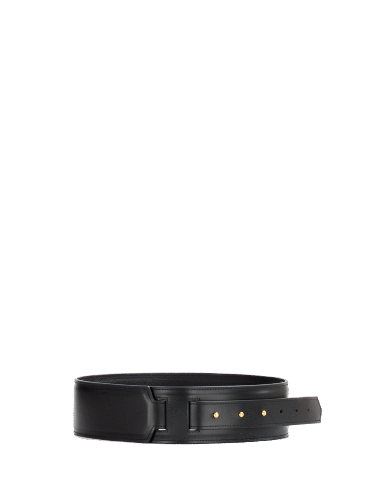 Cinturón Garden. Hecho a mano en cuero de textura lisa con apariencia de brillo sutil en color negro.